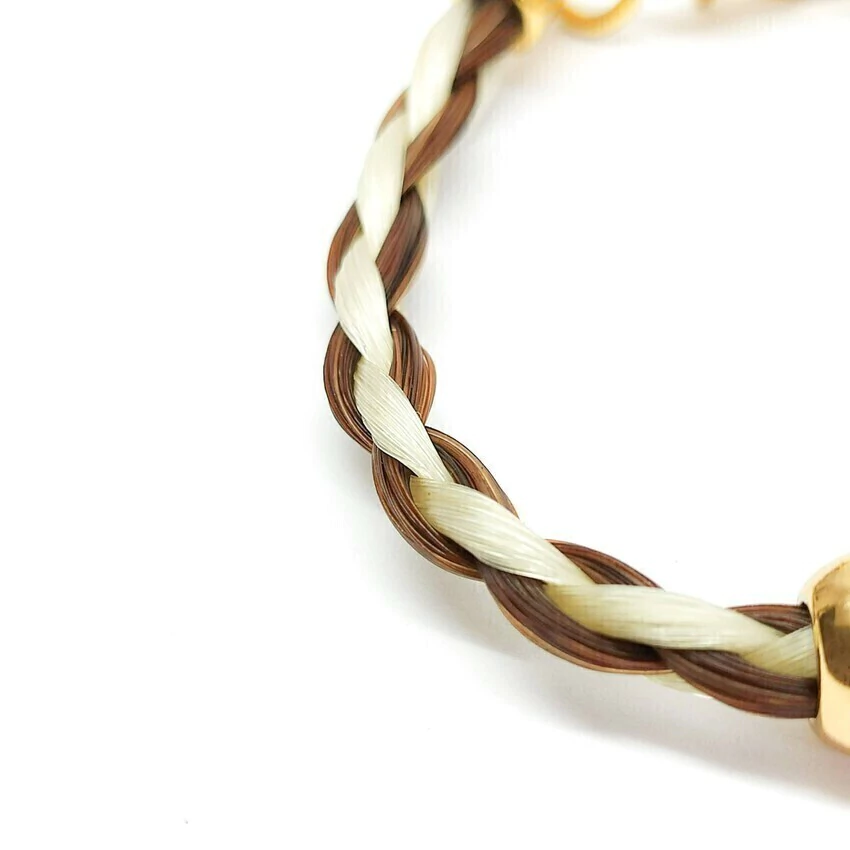 Trança na cor branca Ruana (composição de fios brancos com um leve tom amarelado, natural da pelagem Ruana) e marrom Tostada (composição natural de fios em diversos tons de vermelho, marrom e brancos misturados). E os acabamentos e detalhes em dourado.